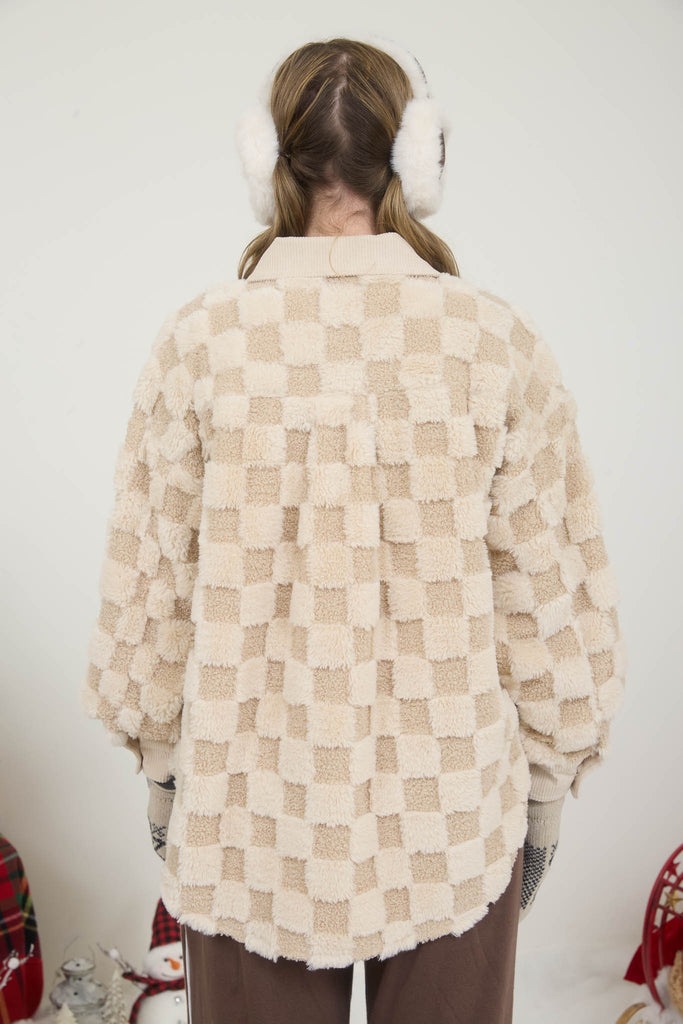 Layer up in effortless style with this checkered shearling shacket—the perfect hybrid between a shirt and jacket. Crafted from soft polyester with a cozy faux shearling pattern, it features a relaxed, oversized silhouette with extended drop shoulders for a contemporary look. The classic button-down collar, long sleeves, and functional flap pockets make it as practical as it is chic. Unlined for lightweight versatility, this piece transitions seamlessly from casual outings to weekend adventures. Available in rich brown and creamy cream.