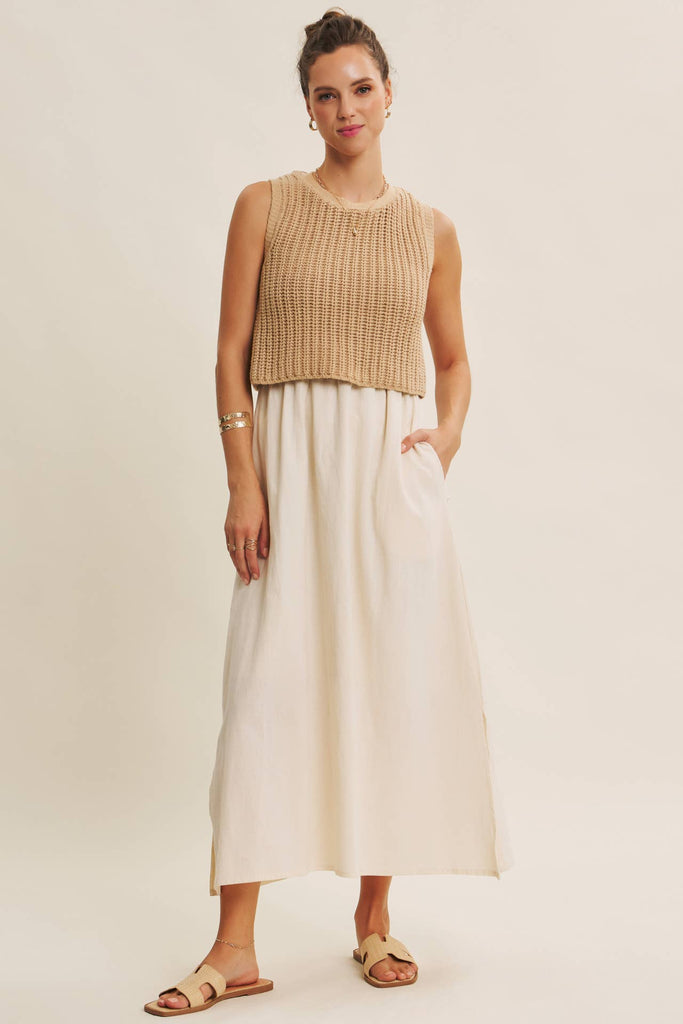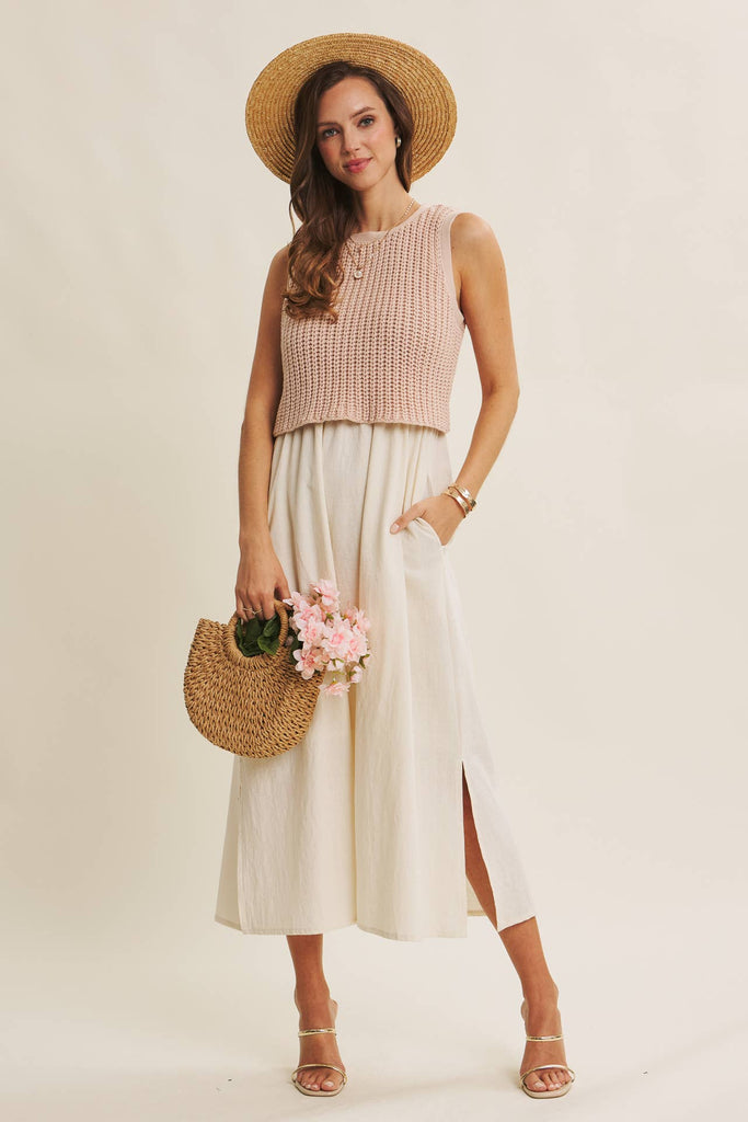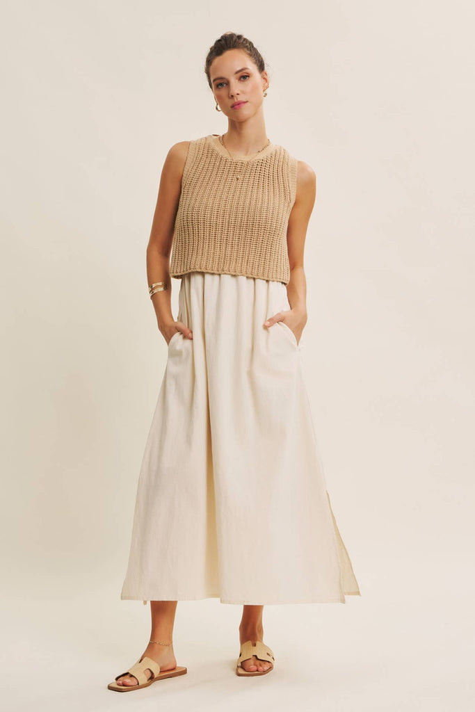 You asked, we brought it back. Our signature twofer midi returns for 2026, ready to carry you through every sunlit day and breezy evening. The chunky sweater knit top offers cozy texture, while the flowy cotton-blend skirt drapes effortlessly with hidden pockets and side slits. A sweet bow tie detail at the back adds feminine charm, making this style endlessly wearable and effortlessly romantic. Designed for market mornings, garden parties, wine tastings, or a simple weekend wander, this dress is the one you’ll keep reaching for. It’s both comfortable and elevated. Relaxed enough for lounging, polished enough for a dinner out. The elastic waist offers ease (maternity- and post-bump friendly), and the fully lined skirt ensures coverage with every step. Timeless and versatile, this piece blends the best of cozy knitwear with breezy summer dressing because sometimes the easiest outfit is also the prettiest.